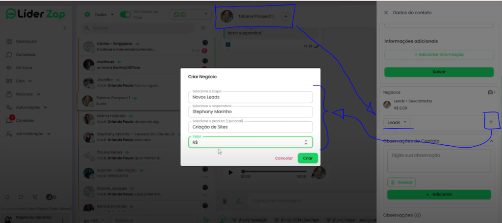 É super simples criar um Card “manualmente” no CRM utilizando a conversa do WhatsApp, mas para isso, o WhatsApp precisa está vinculado no CRM através da leitura do QRCODE da mesma forma que fazemos para conectar o WhatsApp do celular no Web.